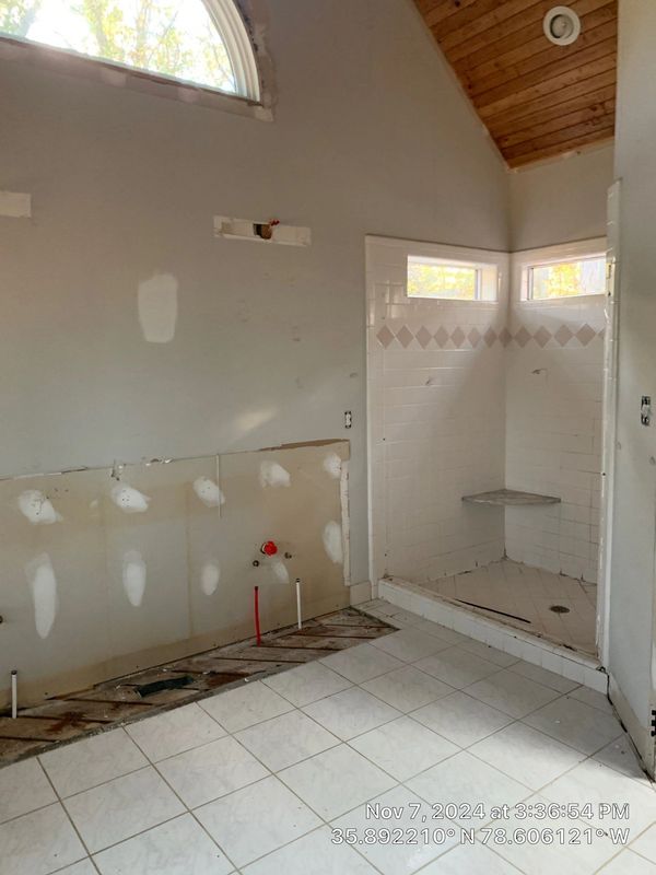 After all components are detached and removed, we then can begin swinging hammers. We manually remove layers of ceramic, porcelain, or marble tile showers, walls, and flooring. We expose all layers of drywall, cement board, other underlayment, and insulation for further removal to get down to the prime layer of subflooring whether it be plywood or a concrete slab. What sets our bathroom demolition and remodeling services apart from others in Raleigh, NC lies in this moment mostly- when we get done removing all the materials, we then take time to thoroughly remove every single nail and screw left over from the framing. We then sweep up all debris meticulously and then vacuum every square inch of the project space. Our goal is to mimic a new construction build when we're done with our tile removal service.